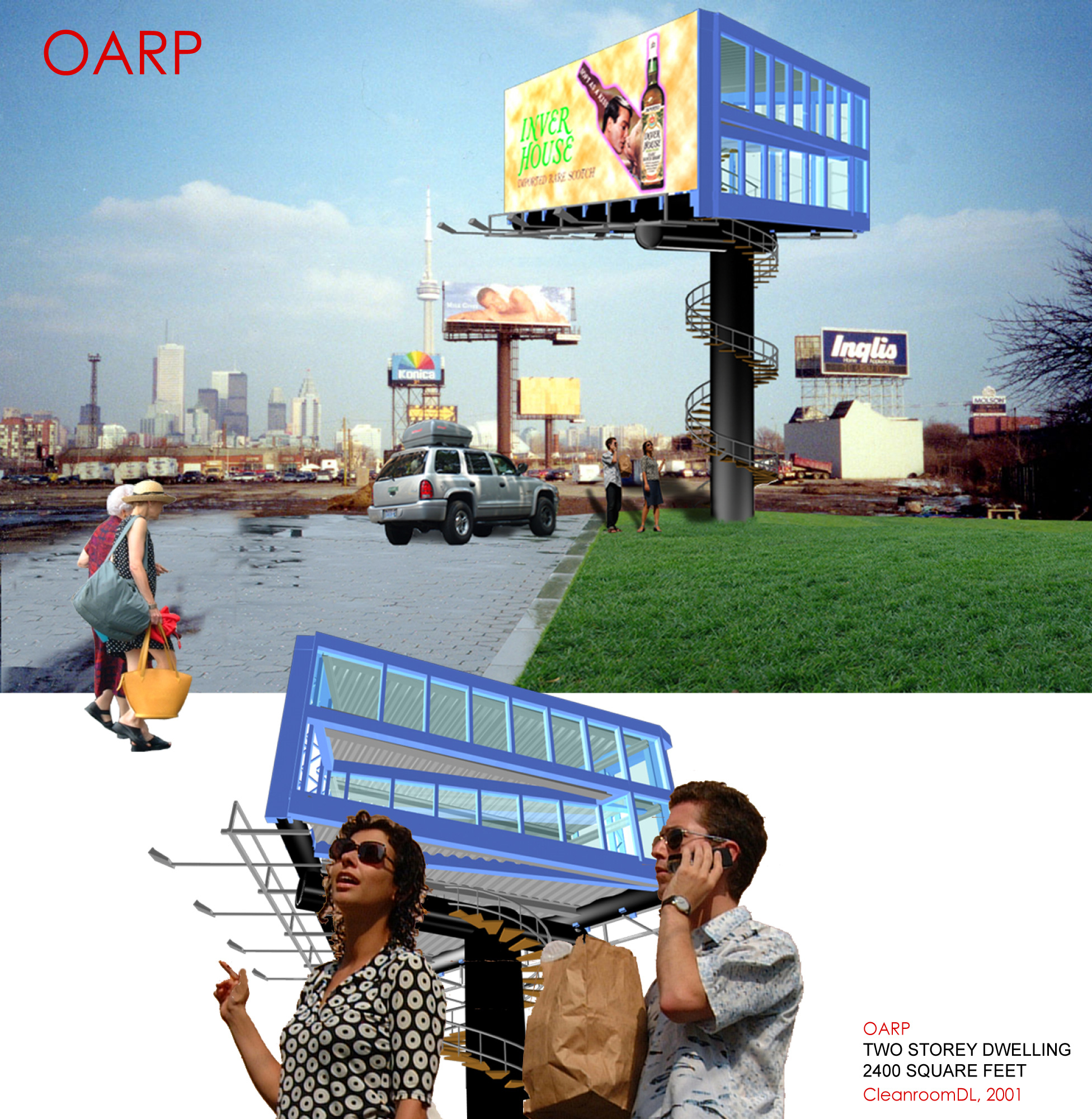 Raised above the urban landscape on a pedestal, the inhabitant of OARP is isolated within the container of the billboard. Elevated above obstructions, the occupant of OARP obtains a privileged view.