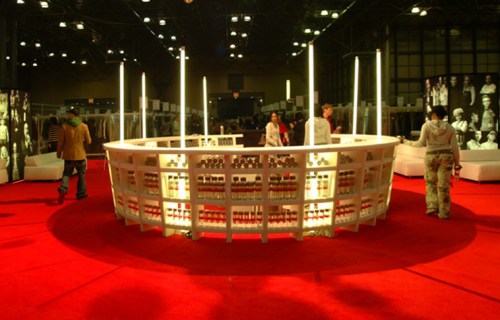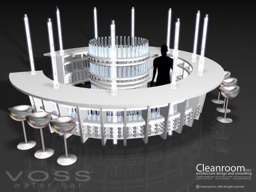 The Voss Water bar is made entirely of aluminum and glass Voss bottles. Designed to promote the Voss Water brand, the bar was cut from a digital template by ‘water-jet’ technology to create a seamless, modular kit-of-parts for easy transportation. No connectors or mechanical parts are required for assembly.