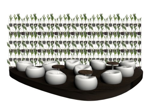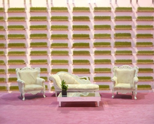 Spine Couch, original furniture designed by David Winston.  Installation, Las Vegas, Aug. 2008.  With Wheatgrass shelves in the background.