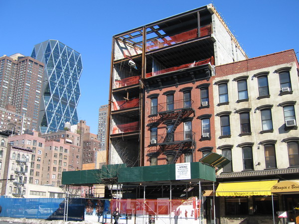 We reached the roof level of 802 9th Avenue. The new 6 story glass and steel frame fuses with the old structure, sweeping under the second floor, up the side and over the top of the existing prewar tenement building . This project began two years ago when David Winston and Cleanroom were commissioned to submit conceptual plans to their client, Palazzo Realty. The building is scheduled to be completed this spring.