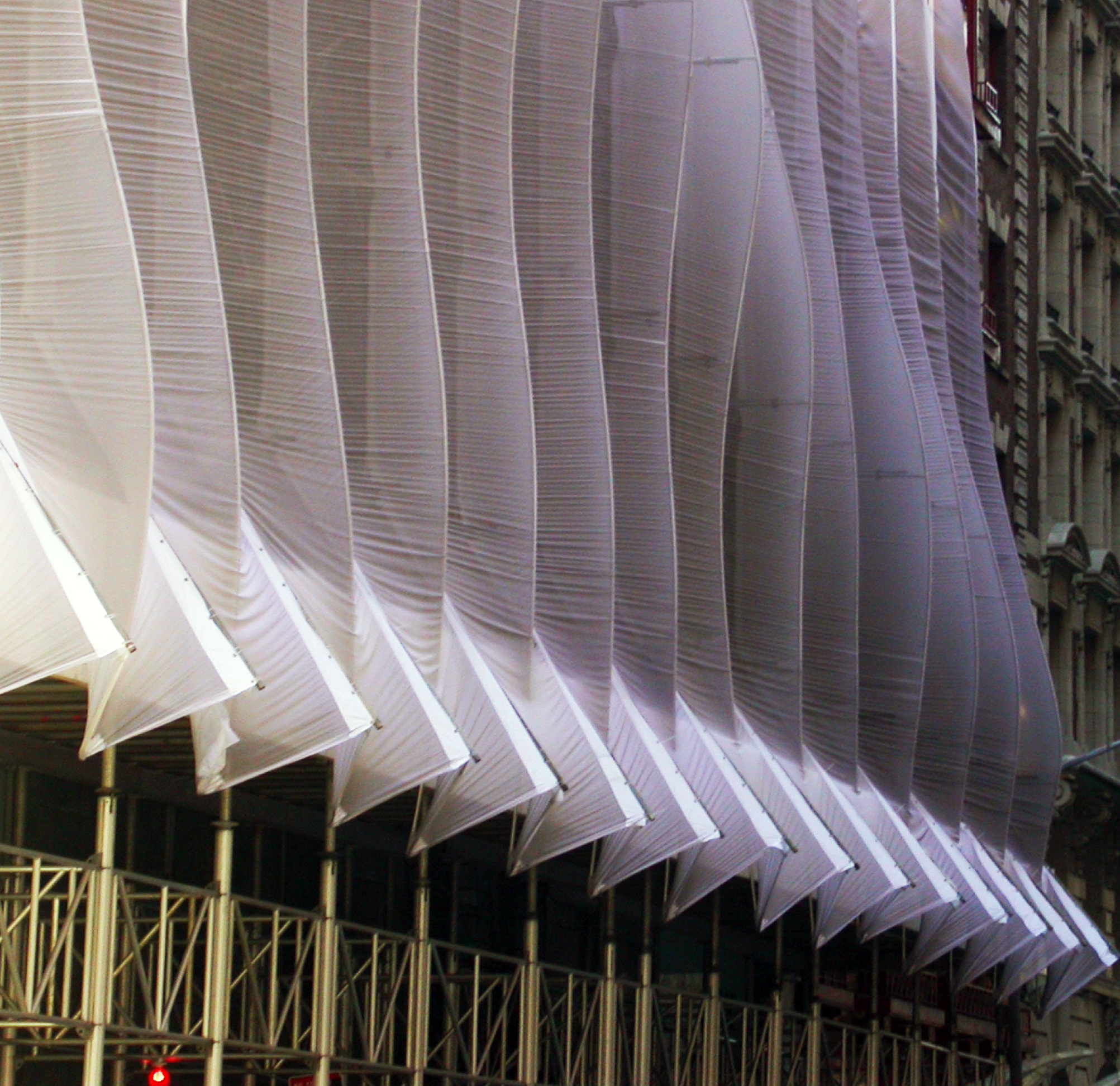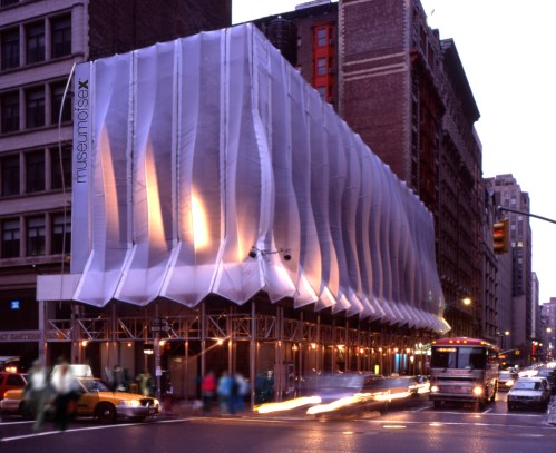 The facade of the museum was created as a temporary installation to celebrate the museum opening in the fall of 2002. The design consisted of a nylon power mesh over undulating aluminum ribcage that simulate the movement of a breathing torso.
