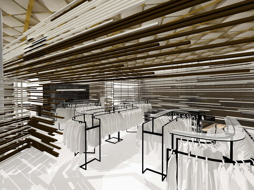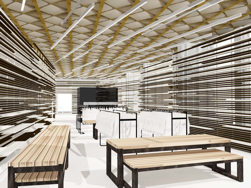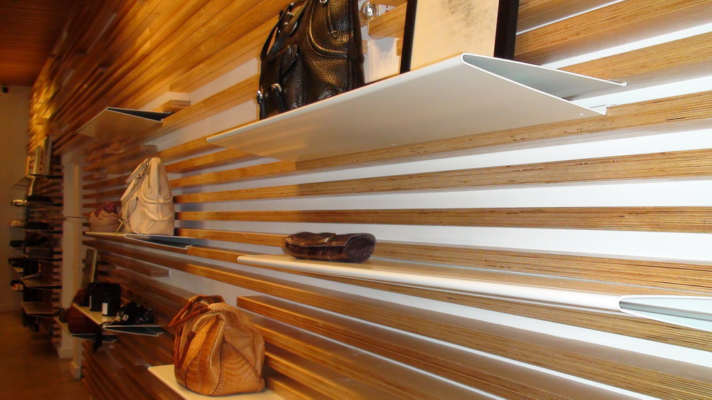This project builds on themes developed in an earlier project that we designed in Miami.  The design phase is complete and we are ready to go into construction mode. This project is for a new boutique on Broadway in NY.  Display fixtures and shelves snap into any location on the wood-slat structure that make up the walls.