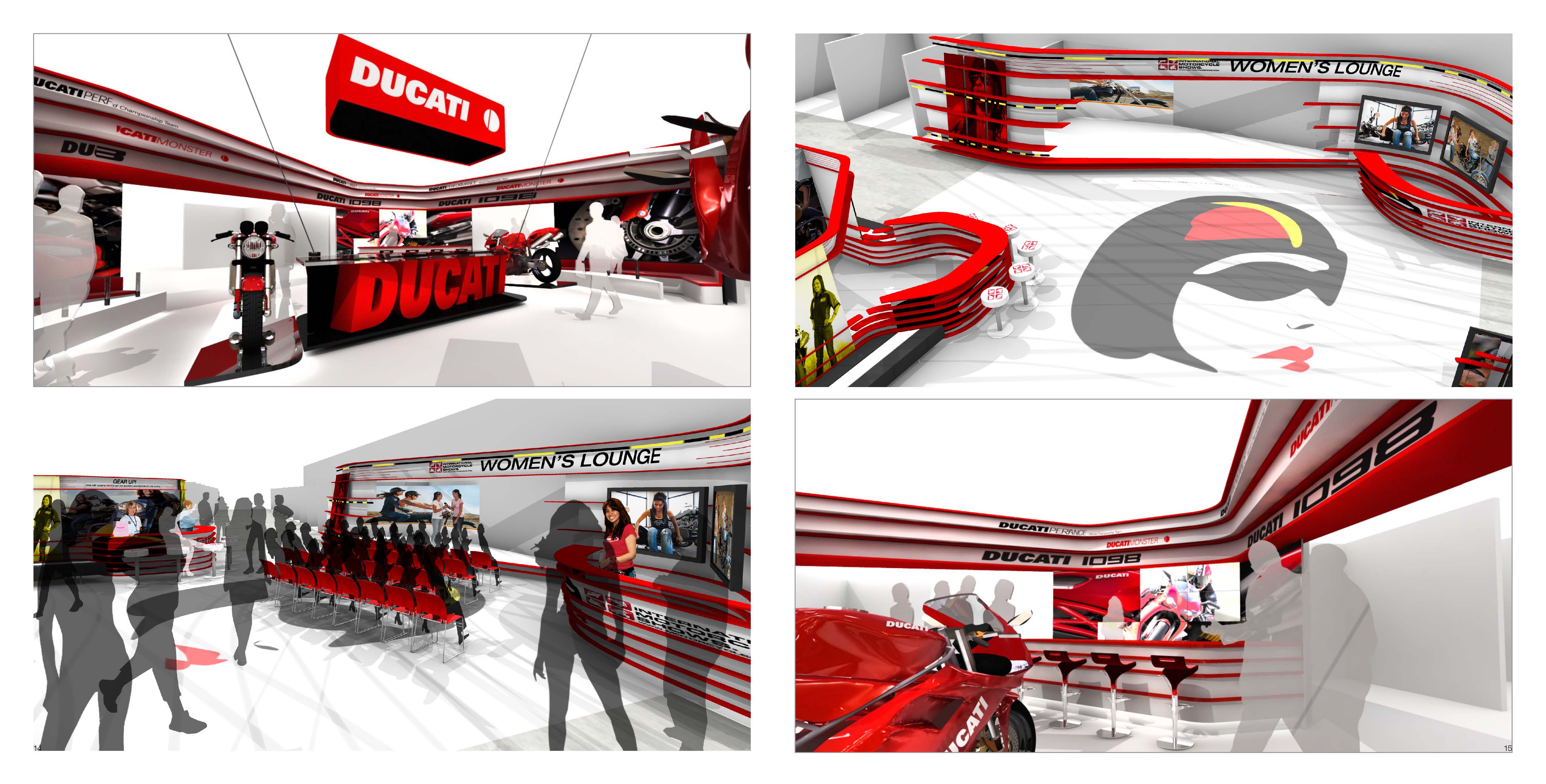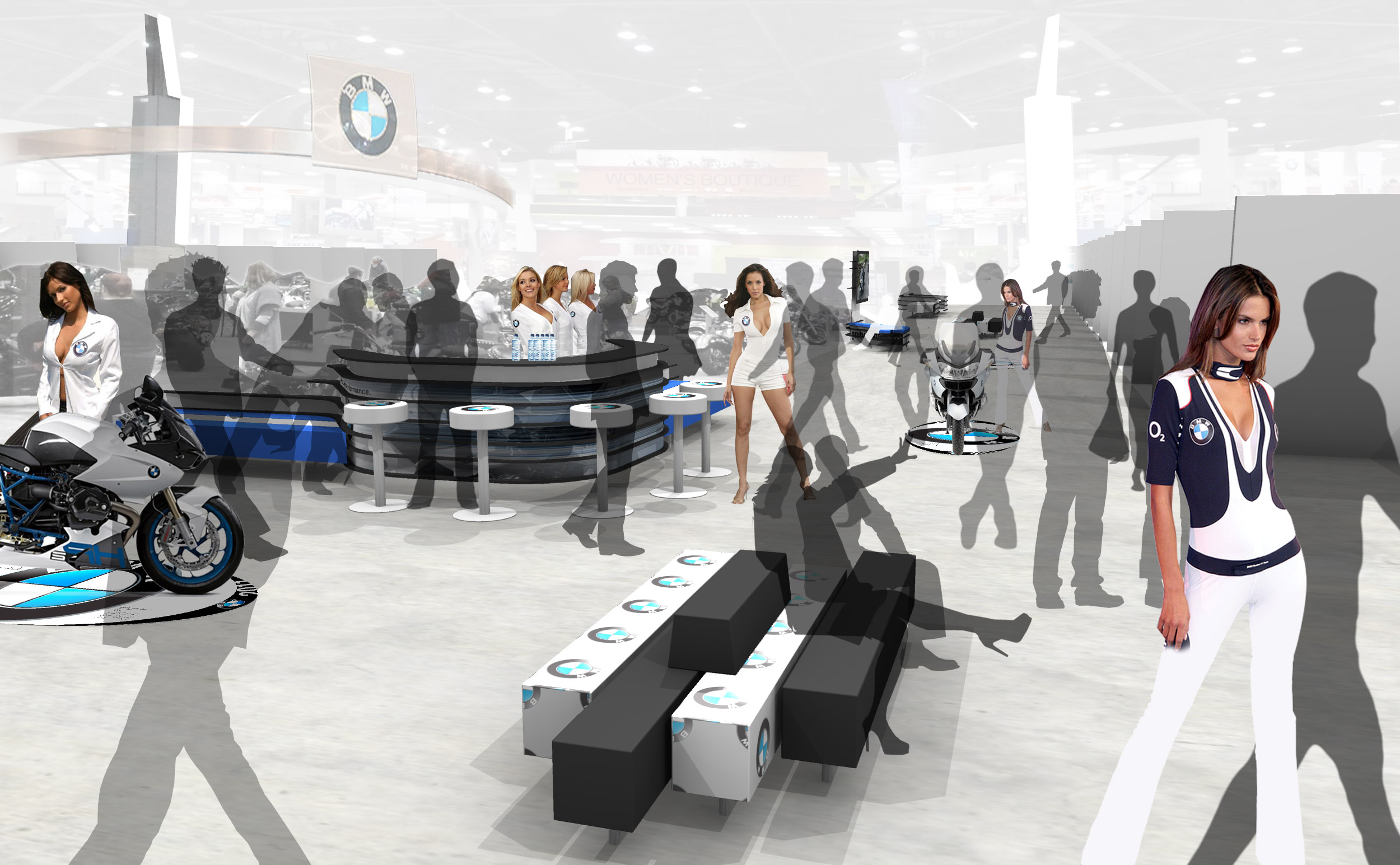 These renderings pulled from our 20010 archive.  The International Motorcycle Show commisioned Cleanroom Inc. to overhaul the look of their traveling Motorcycle show.  Shown here is the BMW installation.